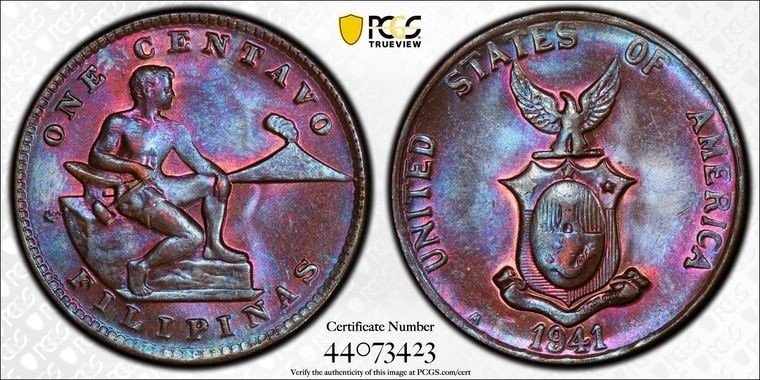 1941-M U.S. Philippines 1 Centavo PCGS MS64BN Lot#G1111 Beautiful Toning!